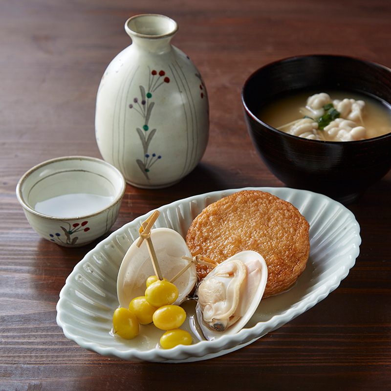 人と人が「仲睦まじく結びつく」といわれている「睦月」は、祝いや宴の料理が多い時季です。初春らしく雪景色に初日の出が昇る情景をイメージし、はんぺんの中にカニ風味蒲鉾を入れた主役の練りもので華やかに日の出