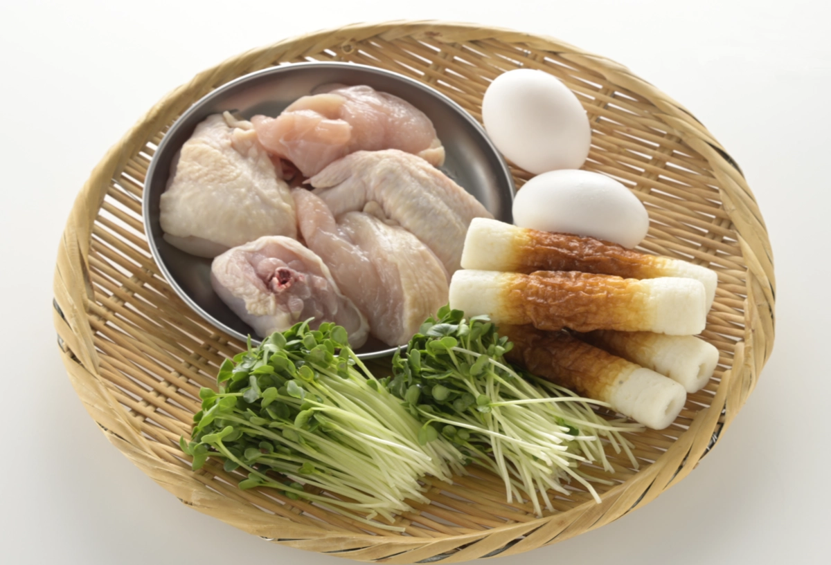 - 器に鶏肉、竹笛、貝割れ菜、卵を盛り付け、汁をはる。