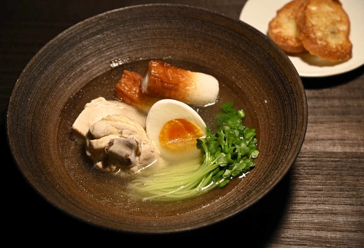 おでんと鶏という組み合わせは合点がいく。鶏ラーメンのイメージがあるからかなあ。澄んだスープなのにしっかりとした味。抜群のだしは、ぶつ切にした鶏の骨からの贈り物だ。トロトロになった鶏肉を食べ終えたら、骨をしゃぶりたい。そうだ。ラーメンを入れるのもいいなあ。さっそくやってみよう。楽しみだ。 この連載が「オデンガク」ではなく「寄せ鍋」だったら「鶏」は最終回になったはず。寄席だけにトリは最後って。おあとがよろしいようで……。