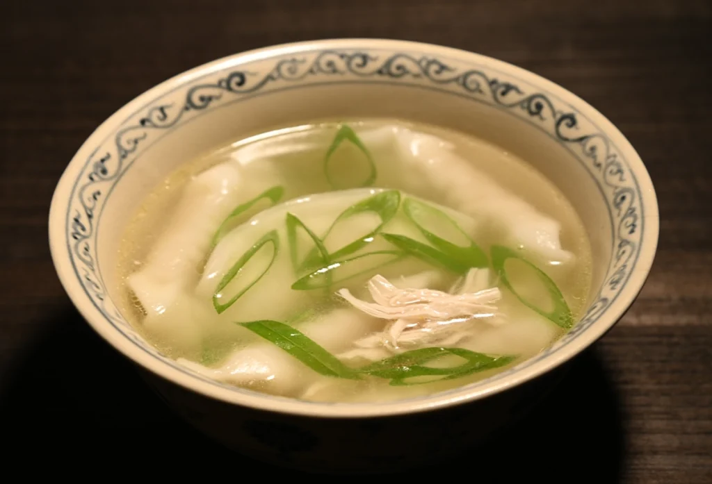 おでん汁で市販の餃子をさっと煮して、ネギをちらせば鶏の滋味深い中華風一品に。