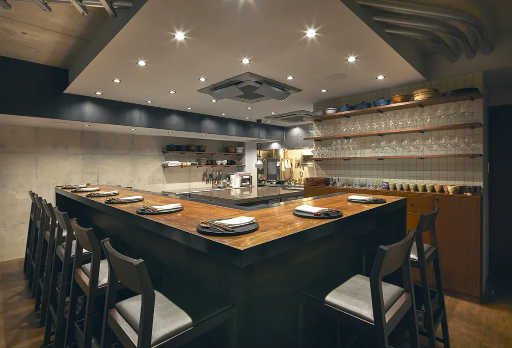 「平ちゃん」の店内は、落ち着いたバーのような雰囲気の空間です。おでんにスポットをあてる照明、木の温もりを存分に感じられるインテリアで、心地よい時間を過ごせます。カウンター席に座れば、ライブ感あふれるオープンキッチンがすぐ目の前に。フレンチシェフの手仕事を、間近で見ながら、創作おでんを味わえます。プライベートなひとときを楽しめる、半個室を含むテーブル席も用意されています。大切な人と過ごす特別な日、「平ちゃん」でしか味わえない、コースおでんを召し上がってみてはいかがでしょうか?